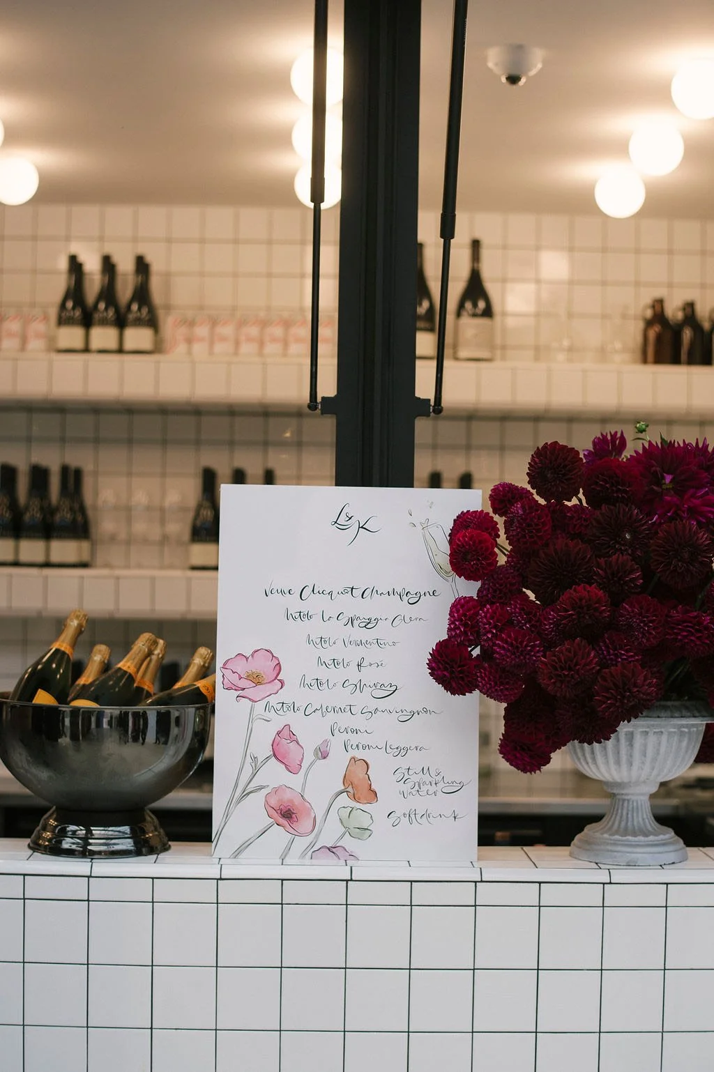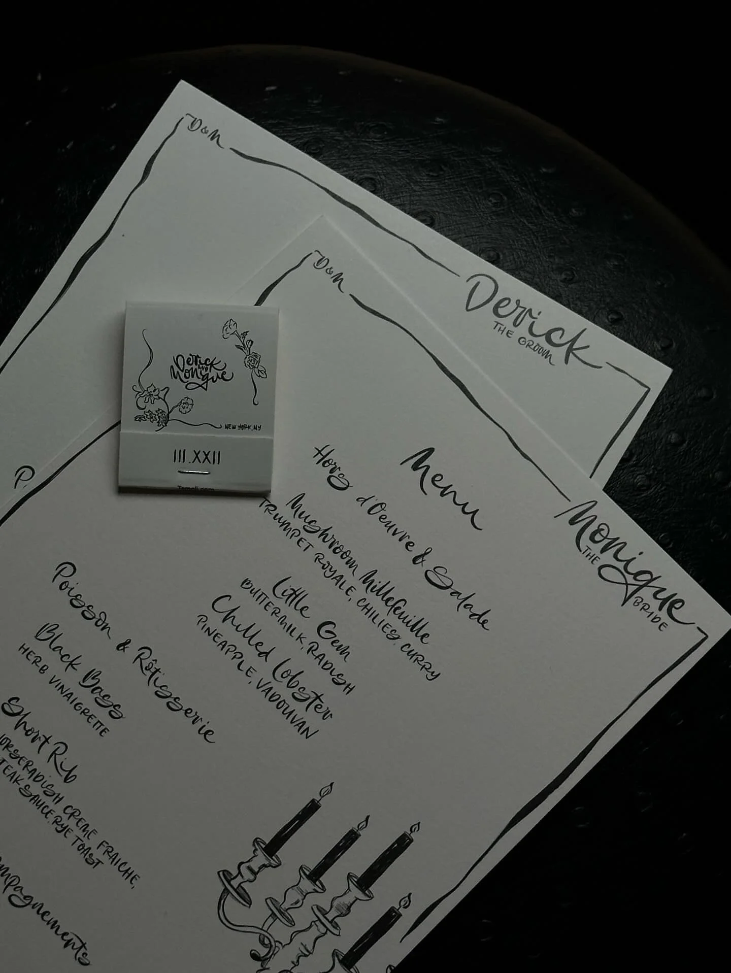 Welcome sign. Menu with Placecards. Bar Menu. Matches. Signage.